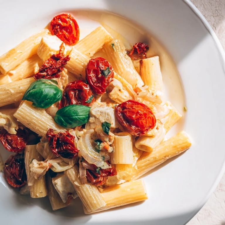 The genius of this recipe is in the oven's work, not yours. High heat bursts the cherry tomatoes and concentrates their sweetness, while the sun-dried tomatoes add a savory umami note that feels intentional and layered. The feta, which might seem like a strange addition to pasta, actually becomes the sauce—soft, creamy, and rich without any cream at all. The pasta water acts as an emulsifier, turning what could be a chunky mess into something silky and clinging. Every component has a job, and they all show up for it.