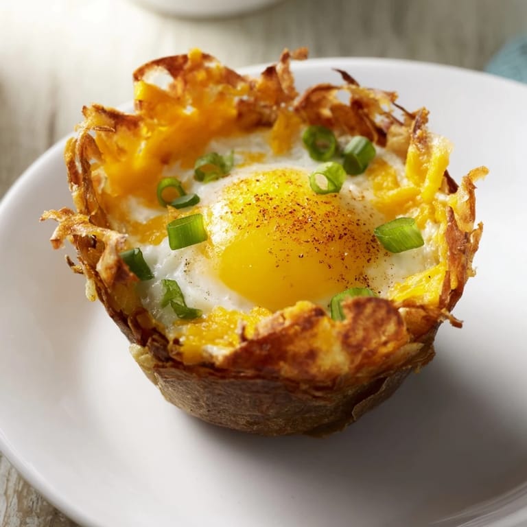Save to Pinterest There's something about Sunday mornings that makes me reach for a muffin tin instead of a skillet. I was rushing through breakfast prep one weekend, potatoes half-shredded and eggs waiting, when I thought: what if I pressed these golden strands into cups and baked them crispy? The result was impossible to resist—little edible bowls you could hold in your hand, filled with melted cheese and a runny yolk. My kids actually asked for seconds, which never happens at 7 a.m.