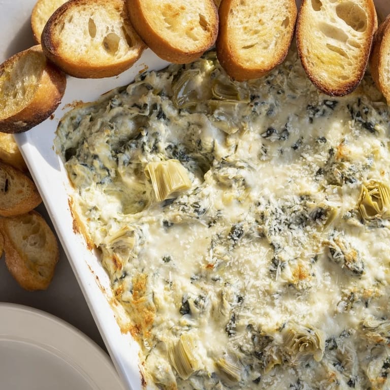 Save to Pinterest A warm, creamy dip featuring spinach, artichoke hearts, and a blend of cheeses, perfect for winter gatherings. Served with toasted baguette slices for dipping.